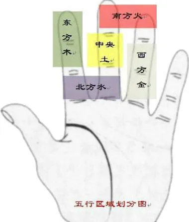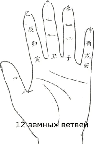 От указательного пальца до мизинца на суставах и между ними располагаются области, связанные с инь и ян, пятью элементами усин (五行), восемью триграммами багуа (八卦), десятью небесными стволами (天干) и двенадцатью земными ветвями (地支).