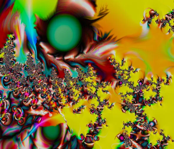 На картине есть множество вкраплений-завитушек, в каждой завитушке, целый маленький мир. Eсли любое из этих вкраплений увеличить, то откроется совершенно новая картина, на которой тоже будут вкрапления, и так до бесконечности.