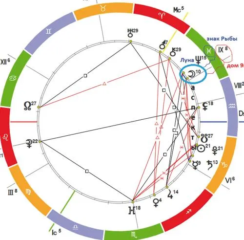 Луна в Рыбах в 9-м доме в аспектах с Меркурием, Сатурном, Солнцем, Плутоном