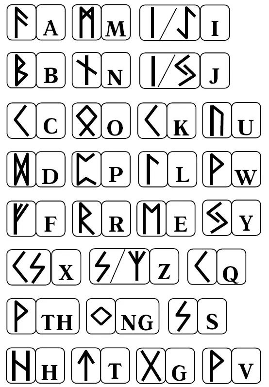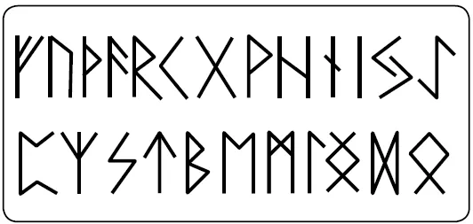 В Исландии в конце прошлого тысячелетия они так и назывались: атт Фрейи, атт Хеймдалля и атт Тора. Каждый из них состоит из 8 рун. По первым их буквам (f, u, th, a, r, k) этот строй и получил свое название – Futhark. Он также часто упоминается как Старший футарк. Ниже приведены знаки, входящие в этот рунический строй.