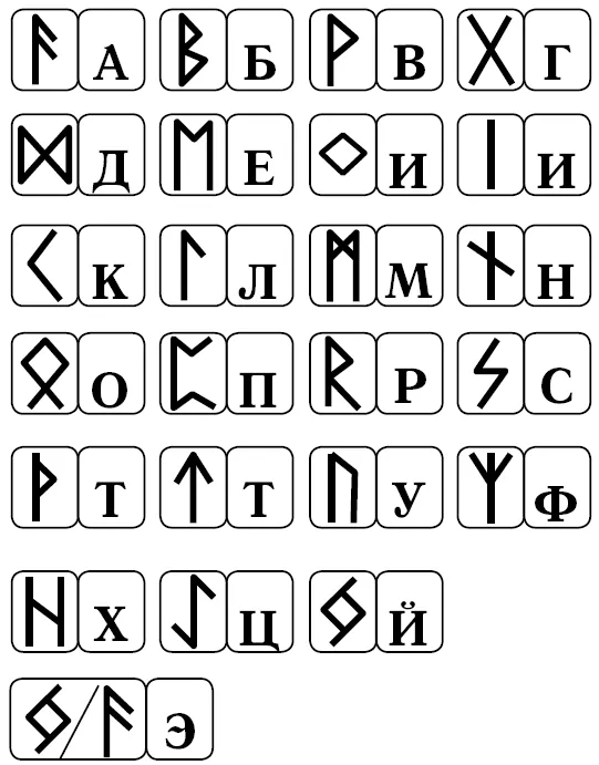На рисунке 10 показаны символы рунического строя футарка с соответствующими им буквами русского алфавита. С течением времен руны, их начертания и значения видоизменялись. Например, уже в X веке в футарке, изобретенном скандинавами, количество рун сократилось с 24 до 16. Так появился новый рунический строй – Младший футарк, который применяли лишь в качестве алфавита для письма. Именно его использовали во времена викингов, но этот рунический строй актуален и по сей день.