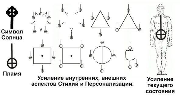 В данной традиции существует специальный символ-усилитель. Это перевёрнутый древний символ Солнца который напоминает Кельтский крест. Символ Солнца – это крест на длинной ножке, с перекрестьем обведённым в круг. Этот символ используется для благословления, но может оказывать и негативное влияние вызывая растрату. В данной традиции его стандартное положение – вверх длинной ножкой, кругом с перекрестьем – вниз. В этом варианте он считается символом пламени, и используется как основной усилитель воздействия. Наносится вокруг символов Стихий и персонализации (последнее, крайне редко). Им можно усилить текущее состояние человека, каким бы оно ни было. Для этого в рабочем состоянии чертим на тыльной стороне фото этот символ так, чтобы он полностью находился внутри контуров тела объекта. Текущее состояние человека усилится и углубится. Спокойный, станет ещё спокойнее, тревожный начнёт впадать в панику, грустный – падёт в пучину горечи. Весёлый – ещё больше возрадуется без видимых на то причин. Здоровье так же улучшится/ухудшится в зависимости от исходного состояния. Разумеется, этим символом можно вызвать только усиление эмоций, или только параметры здоровья. Для этого в рабочем состоянии мы нанося символ закладываем в него нужный нам смысл.