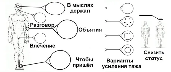 Чертится тяж так: маленьким кружочком отмечается область его приложения, от него идёт линия, которая раздваиваясь касается круга. Сам тяж можно усиливать нанося в его большой круг символы активации, персонализации и даже круга. Если мы чертим в тяже круг, то мы зацикливаем объект на данном действии. Тяжами можно активировать следующие области: стопы ног – чтобы пришёл; половые органы – чтобы было влечение; локти – чтобы желал объятий; рот – чтобы вышел на связь, хотел больше говорить; лоб – чтобы думал, из головы чтобы цель не выходила.