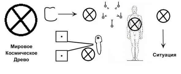 Это знак высвобождения, открытия пути, устранения помех. Если мы знаем точно, что у нашего объекта воздействия имеется партнёр, то мы ставим этот круг в кресте прям напротив стрелочки указателя нашего влияния. Если мешают родственники или обстоятельства, то ставим этот знак рядом с рисунком основного действия. Это знак можно чертить во множественном количестве. Один такой знак закрывает человека от влияния одного-трёх человек. Если мешают шестеро то можно начертить два таких значка и более. Если этот знак начертить на обратной стороне фото и написать список предметов, то человек не будет их терять. Если же его чертить на лицевой стороне фотографии символизирующей окружающий мир и то, что человек для него представляет, то список предметов под символом заставит человека потерять их. Если знак чертится не на теле человека, а рядом, то мы ограждаем его от помех со стороны. Если чертим этот знак внутри контуров тела человека, то это приведёт к тому, что человек сам себе не будет мешать выполнять наложенное нами действие. Начертание этого знака на лицевой стороне фотографии на лбу приводит к риску возникновения инсульта, на сердце – к риску инфаркта, на половых органах – к импотенции. Это можно использовать для нанесения вреда в купе с другими воздействиями.