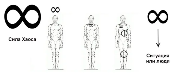 Если бесконечность помещают в контуры тела, то зоны, отмеченные Стихией, будут разрушаться в первую очередь и очень быстро. Помещение на какие-либо зоны персонализации лишь немного усилят эффект в сравнении с активацией. Самый сильный и опаснейший эффект вы получите, если активируете ту или иную область кругом. Это влечёт крайне тяжёлые и быстрые последствия. Максимальное разрушение, которое может произойти, как по внутренним причинам организма, так и из-за случайности.