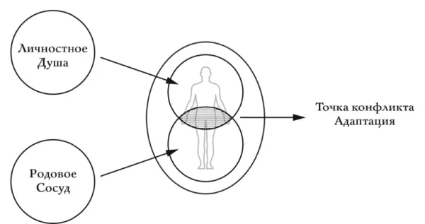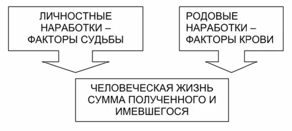 Посмотрите на схему. Вот что происходит при рождении человека. Сумма его личностных наработок, приобретенных им во время предыдущей жизни, взаимодействует с суммой наработок того рода, где он был рожден. Так формируется новый человек, новая стадия развития души.