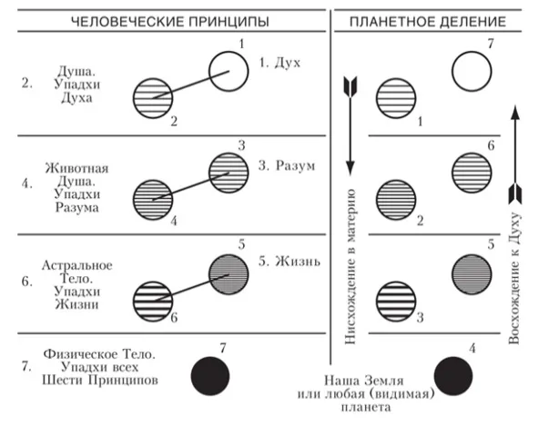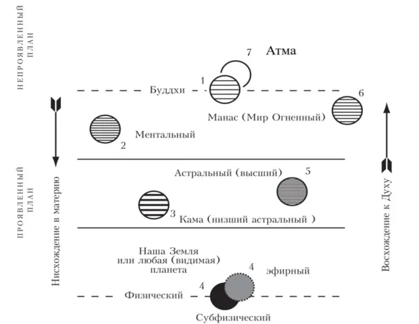 Для общего случая на рисунке ниже показаны три проявленных плана и один непроявленный (самый верхний). Говоря о «проявленном» и «непроявленном», необходимо помнить, для кого они таковы. Невозможна конкретная форма восприятия (конкретный мир) без субъекта, который мог бы её именно в таком формате воспринять. Способность сознания определять «верх» и «низ» («тонкость» и «плотность») для проявленности определяется форматом сознания. На рисунке ниже показано распределение проявленности и непроявленности для сознания существ нашей Солнечной системы, в том числе