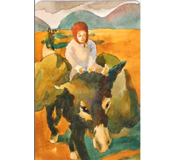 Девочки сидит на ослике. С каким – то скарбом, с какими – то пожитками и она уходит со своего насиженного места. Она не хотела, но ее злая молва оттуда выгнала. Она вынуждена была уйти. Такое ощущение, что ребенок вне брака, а это если рассуждать, то это уже 19 век.