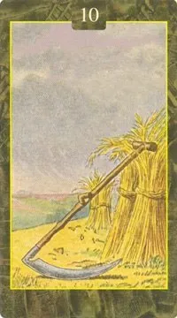 Общее значение карты – сбор урожая, получение результатов. Расчистка пространства. Время принимать важные решения. Однако, многие авторы считают, что эта карта – предупреждение о больших опасностях и разрушениях.