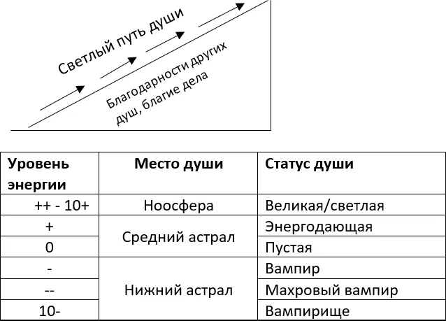 Души при воплощении обладают определенным запасом света и живой энергии. Эти параметры заданы исходя из прошлого опыта души. Если путь души устлан искренними благодарностями других душ, то душа увеличивает свою светлую сторону и получает больше энергии. И так из воплощения в воплощение двигаются чистые и трудолюбивые души вверх к ноосфере и иерархии света и наиболее способные, активные и трудолюбивые доходят до самого верха.