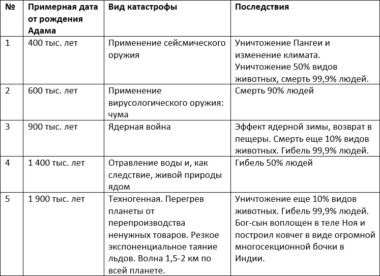 Изначально люди были в одной расе, можно назвать ее белой расой. Катастрофа № 1 привела к тому, что белые люди стали жить в измененном климате с системой питания, доступной в данной местности. Черная раса сформировалась из-за дефицита воды в местности. Желтая раса сформировалась из-за употребления в пищу риса. Расы и национальности образовались в результате локализации в разных частях планеты своего микроклимата и системы питания. У всех рас один изначальный творец – Бог-сын.