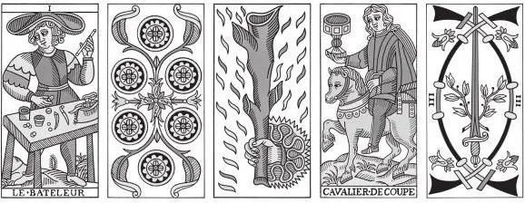 Остальные 56 карт делятся еще на четыре масти. Они называются минорными мастями, и их рисунок более прост, чем у 22 мажорных карт. Четырем мастям присвоены названия четырех символических предметов – монет, жезлов, чаш и мечей. Каждая минорная масть включает 14 карт трех типов: один туз, девять номерных карт (от 2 до 10) и четыре карты двора – паж, рыцарь, королева и король. Таким образом, структура минорных мастей напоминает обычные игральные карты. Главное различие в том, что в игральных картах есть только три карты двора – валет, королева и король.