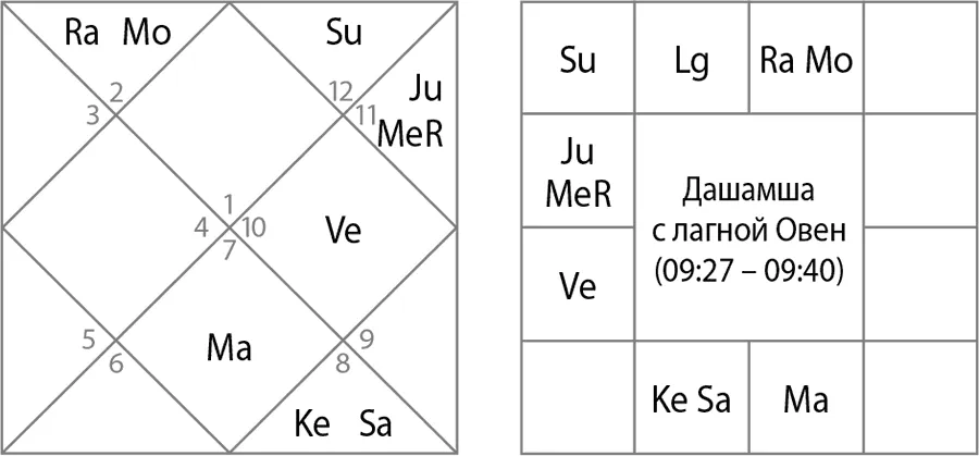 Дашамша с лагной Овен (09:27 – 09:40, см. рис. 18). Венера расположена в 10-м доме, как хозяйка 8-го и 2-го дома, а во 2-м доме Луна. Хозяин 10-го дома стоит в 8-м на оси Раху-Кету – это говорит об отсутствии успехов и работе ради заработка. Не рассматриваем дальше эту дашамшу.