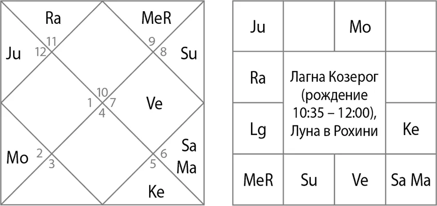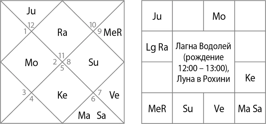 Лагна Водолей (см. рис. 7). Здесь Раху в лагне, Юпитер во 2-м доме. При этом Юпитер – хозяин 11-го и 2-го домов, что формирует сильнейшие дхана-йоги, а надо сказать, что Федор Конюхов – человек очень аскетичный и небогатый, несмотря на свою известность: у него нет ни машины, ни квартиры. Он живет в своей художественной мастерской, которая едва приспособлена для жилья, и постоянно странствует. Эта карта нам не подходит, тем более если мы рассматриваем ее по дашам.