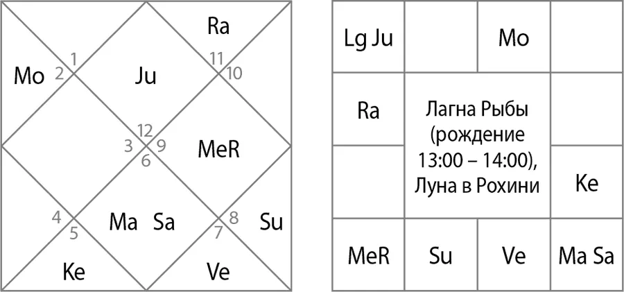 Лагна Рыбы (см. рис. 8). Пожалуй, лагна Рыбы могла бы быть вероятной и претендовать на то, чтобы показывать время рождения. Давайте рассмотрим ее. При лагне Рыбы формируется хамса-йога, но уже в лагне. Юпитер является хозяином 10-го дома, а в 10-м доме находится Меркурий. Это могло бы дать ему художественные и литературные способности, но давайте рассмотрим дома путешествий. В 3-м доме находится Луна, а его хозяйка Венера стоит в 8-м доме, и она достаточно сильная. Однако Венера здесь формирует асура-йогу. Конечно, хамса-йога в лагне может нейтрализовать эти влияния, но меня эта лагна не убеждает. Здесь уже необходима не только теория, но и практика, или, если хотите – интуиция. Я рассматривала эту лагну как вероятную, но не приняла ее по той простой причине, что он – не Рыбы. И это аргумент астролога!