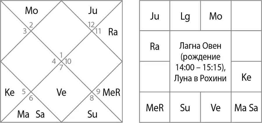 Лагна Овен (см. рис. 9). Здесь мы не будем подробно рассматривать эту карту, в которой малавья-йога в 7-м доме, Юпитер в 12-м доме и лагнеша с хозяином 10-го дома находятся в 6-м. Это не гороскоп Федора Конюхова.