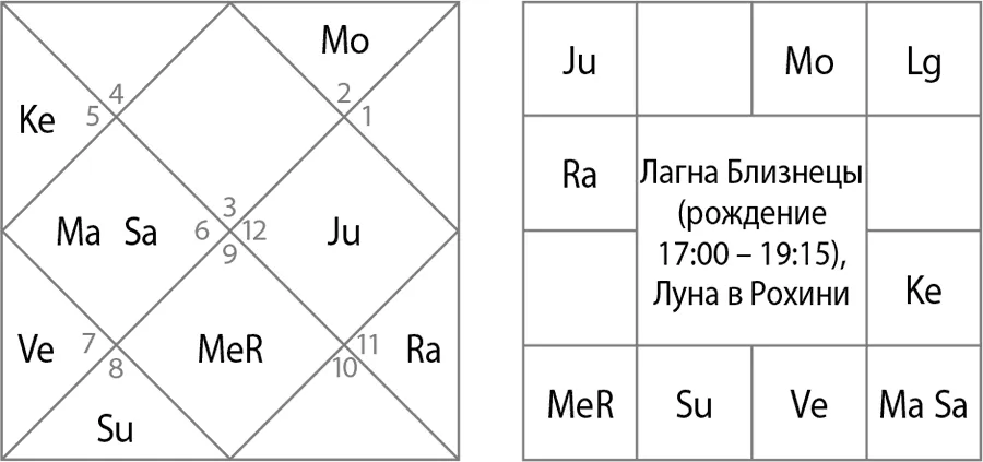 Лагна Близнецы (см. рис. 11). Здесь ретроградный хозяин 1-го дома в 7-м, влияние на 10-й дом Марса и Сатурна, при этом Марс – хозяин 6-го и 11-го дома, а Сатурн – хозяин 8-го и 9-го. Всю свою деятельность Федор посвящает Богу. Он говорит: «Я путешествую во славу Бога». Это не просто слова – для него это совершенно искренняя позиция. Это вообще очень искренний человек. Он не получает доходы от путешествий и путешествует не для того, чтобы зарабатывать деньги.