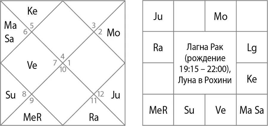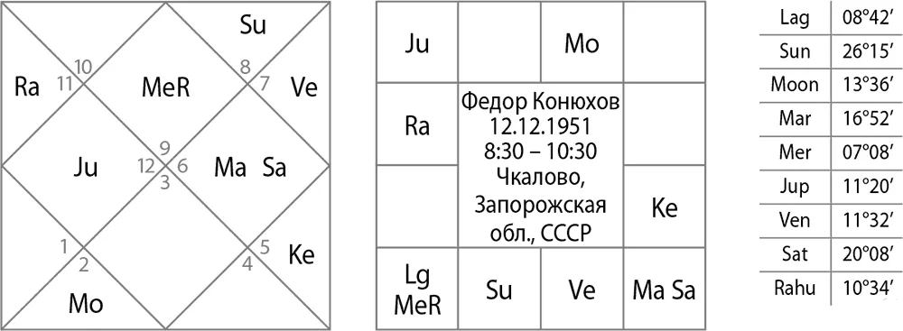 Лагна Рак (см. рис. 12). Это «водная» лагна с сильным Юпитером в 9-м доме. Но здесь мы видим экзальтированного лагнешу в доме камы, доме доходов, почестей, наград. Да, Федор Конюхов – человек известный, но он не стремится делать на своих путешествиях имя, деньги или славу. Поначалу его просто не воспринимали серьезно. Его путешествия не оплачиваются, правительство не поддерживает его в подготовке к рекордам. Федор собирает все свои экспедиции на собственные средства или находит поддержку среди друзей и других людей. Его иностранные коллеги по цеху получают зарплату, премии, гранты, а он все делает в одиночку. Но его поддерживают друзья, семья и другие люди, иногда незнакомые, и это, безусловно, великая поддержка.