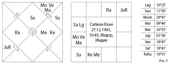 В карте раши Салмана Кхана (см. рис. 3) Мангала – хозяин 3-го и 10-го домов и находится в Абхиджит в учче в 12-м доме. И оттуда аспектирует собственный 3-й, а также 6-й и 7-й дома. Но мы видим не только непобедимый нрав, мы видим здесь куджа-дошу. Салман известен как фанат спорта и боевых искусств. Он настоящий «тигр Болливуда». Недавно, кстати, вышел фильм с его участием, который так и называется: «Тигр жив». Актер также является и режиссером этого фильма. То есть он знает о себе это. Он эмоционален, силен, его ничего не беспокоит – ни успех, ни его неудача, ни суперслава.