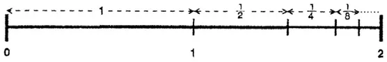 Обозначим его левую границу числом 0, середину – 1, а противоположный конец – 2. Процесс суммирования членов ряда можно представить последовательностью точек. Прибавление каждого последующего члена делит оставшуюся часть отрезка пополам. После бесконечного (и никак не меньше!) числа шагов сумма ряда станет равна двум, однако этого значения невозможно достичь никаким конечным количеством сложений. Двойку нельзя получить, даже если складывать эти уменьшающиеся дроби на протяжении целого гугола лет. Гугол представляет собой вот такое число: