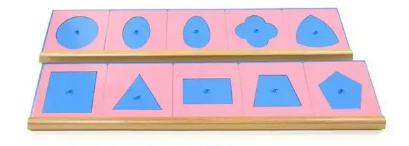 Это 2 подставки с 5 розовыми металлическими рамками каждая. Сторона рамки длиной 14 см. К рамкам прилагаются вкладыши синего цвета: квадрат, прямоугольник, круг, эллипс, яйцо, трапеция, пятиугольник, треугольник, квадрат с 4 полукругами. В середине каждого вкладыша имеется выступ, чтобы можно было удерживать вкладыш двумя пальцами