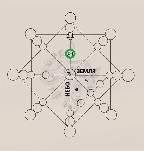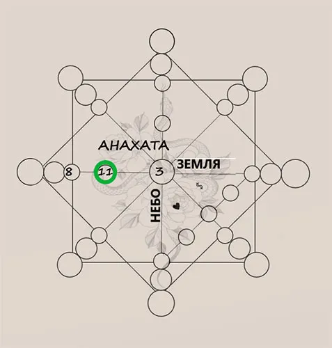 Далее переходим к зоне Анахаты. Это сердечная чакра, отражает потребности человеческой души. Рассчитываем первую точку Анахаты, расположенную на линии Земли. Для этого сложим энергию родительского аркана с энергией зоны комфорта: 8+3=11.