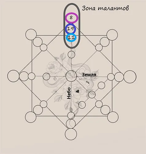 Таланты есть у каждого человека, это врожденные способности. Три аркана сверху, расположенные на линии Неба, – это сильные стороны, наработанные нами из прошлых воплощений или с памятью предыдущих поколений. Задача детей – раскрыть эти таланты, которые могут им помочь в будущем в работе, отношениях, самореализации. Задача же родителей – помочь раскрыть таланты своего ребенка, вовремя направить в нужном направлении. Для этого необходимо в первую очередь признать свои таланты, осознать свою уникальность благодаря им и чаще вспоминать о них, регулярно проявляя, применяя их в жизни. У детей – развитие талантов через кружки, секции.
