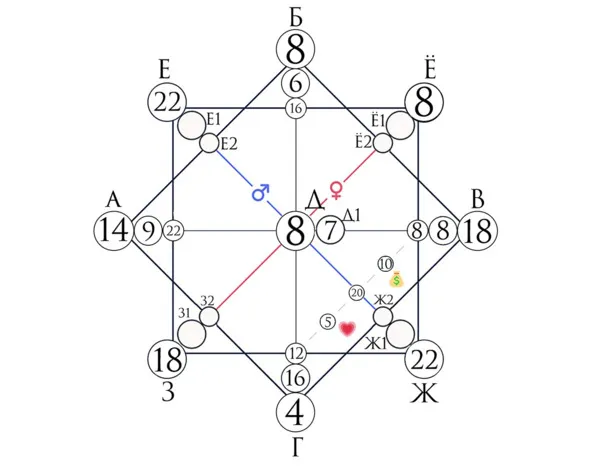 А вот после этого наступает интересный момент, т.к. перед тем, как просчитывать линии, нам нужно рассчитать центр родового квадрата – точку Д1. Данная точка называется сила рода. Именно через эту точку делается расчет родовых линий, а не через наш центр.