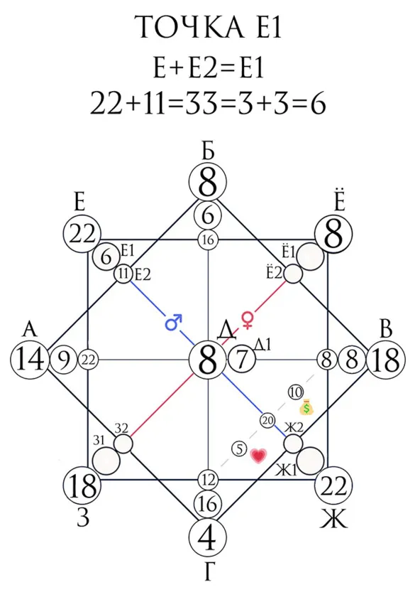– Точка Ё – Б+В=Ё, т.е. 8+18=26=2+6=8
