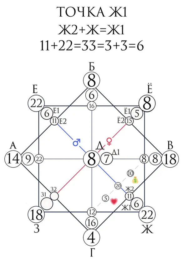 Точки Ё1 и Ё2 являются дополнительными и дораскрывают главную точку. Они указывают нам на то, что могли совершить женщины в роду, что к нам это пришло на отработку или пришло как талант.