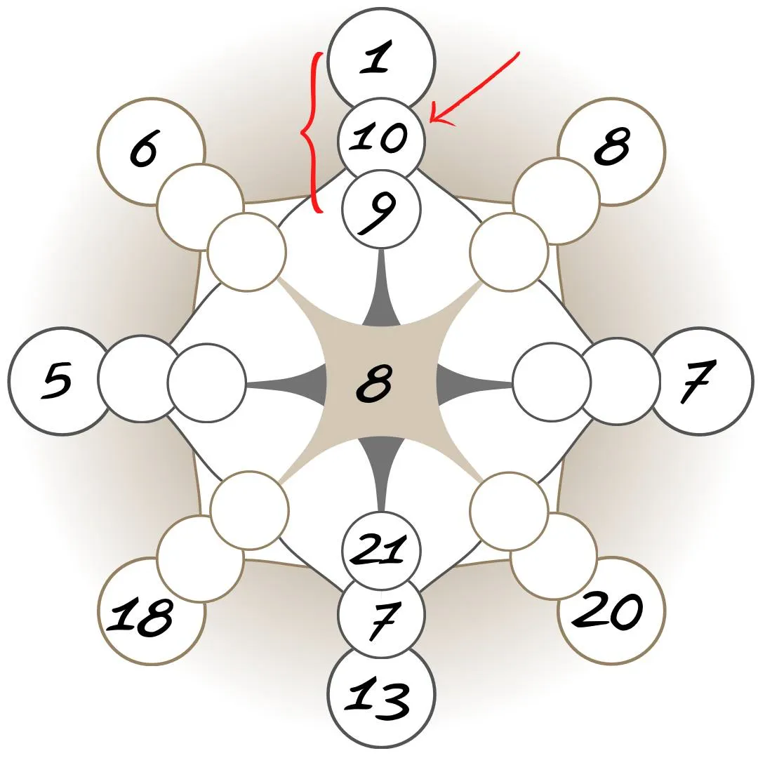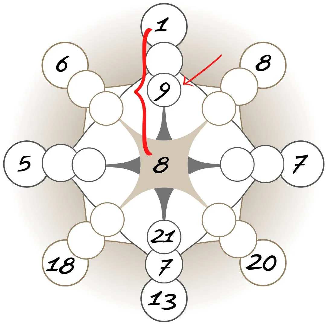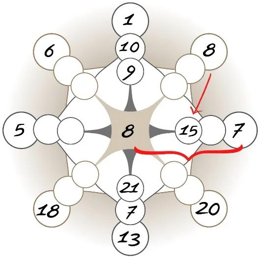 Для начала рассчитаем точку материальной кармы прошлого. Эта энергия стоит на стыке финансового канала прошлого и настоящего. Одна позиция нам уже известна – правый угол матрицы. Рассчитываем второе значение, путем сложения цифры центра и правой вершины матрицы:
