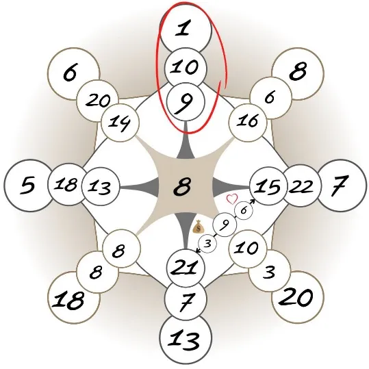 Начнем с Высшей сути, зоны талантов и навыков. Аркан месяца рождения показывает нашу связь с высшими силами, Ангелом-хранителем, интеллектуальные способности, духовность. Ключ, который образован вверху матрицы и где аркан месяца является первым из трех – называют еще ключом талантов и навыков прошлого.