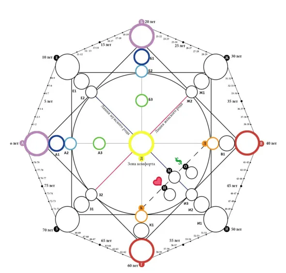 Чтобы рассчитать Энергии по кругу Матрицы Судьбы, энергии по годам жизни, следуем этому же алгоритму. Берем отрезок жизни с точки А по точку Е и делим на 8 одинаковых отрезков, то есть, должно получится 7 точек в этом промежутке (см. рисунок). Таким же образом рассчитываем Е – Б, Б – Ж, Ж – В, В – И, И – Г, Г – З, З – А.