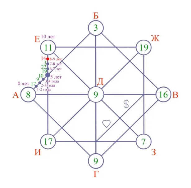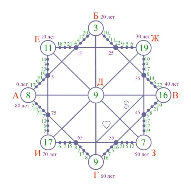 9. По такому же принципу просчитываем остальные отрезки в периметре матрицы. Принцип – сложение в середину отрезка. Отрезками являются промежутки от 0 до 10 лет, от 10 до 20 лет, от 20 до 30 лет и т. д. На 80 годах, мы снова возвращаемся к 0 лет.