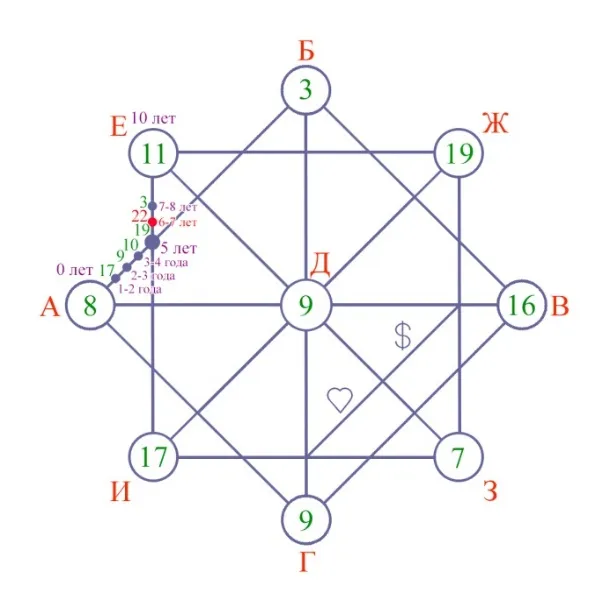 3. Затем находим троичный код Энергий года, который необходим нам для того, чтобы мы могли до бедующего дня рождения поработать над ней. От найденной точки нынешнего возраста клиента, проводим прямую линию на противоположную сторону, в моем случае линия была проведена от 55 годам к 15.