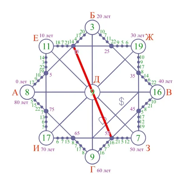 Если бы, к примеру, линию нужно было провести от 34 лет, то мы, чтобы проверить, правильно ли была проведена линия, должны отсчитать, сколько стоит делений до 34 лет, ровно столько должно быть делений на следующей стороне от большого кружочка.