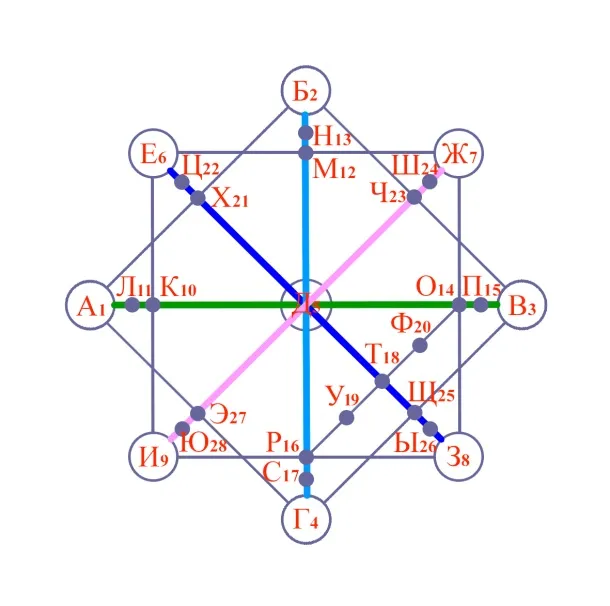 На схеме рядом с буквами показаны цифры по порядку расчета. Все тройки энергий (тройничные ключи) начинаются с больших кружочков.