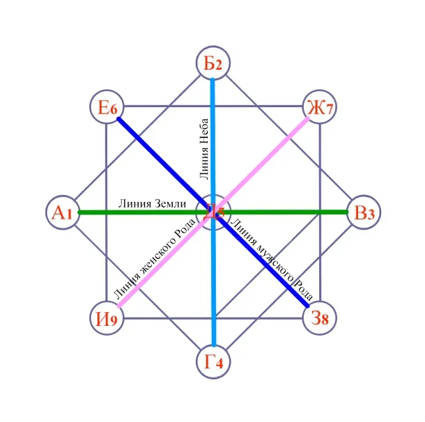 Точки (Е, Ж, З, И) – это родовые программы по линии отца и матери. Начало Рода начинается сверху и идет вниз.
