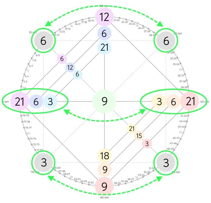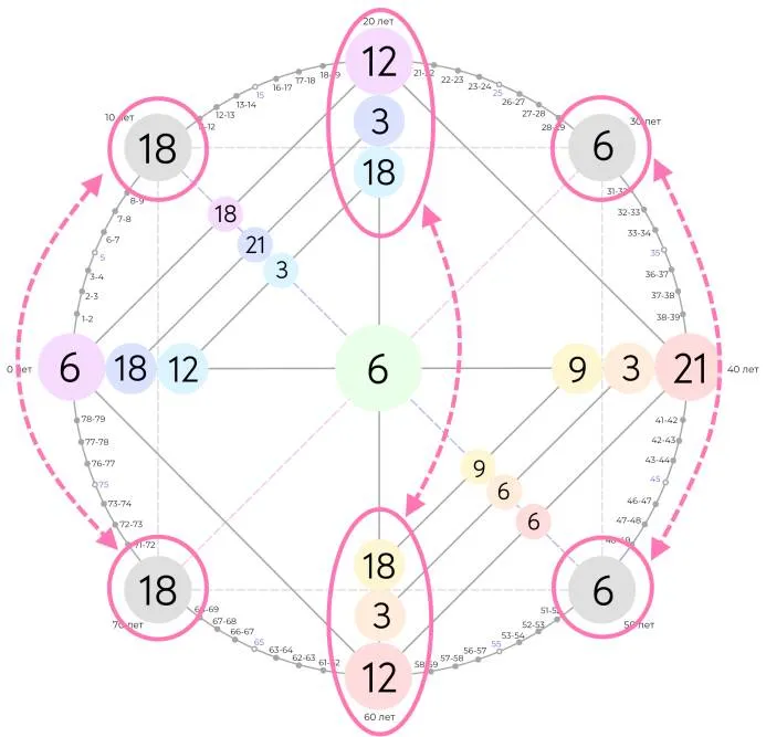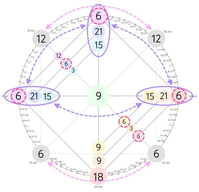 Ещё один вариант зеркальной матрицы. Помимо того, что отзеркаливаются сочетание энергий, можно заметить, что энергии повторяются на разных чакрах. Например, одна энергия влияет на четыре чакры. Таким образом, если человек будет прорабатывать всего одну энергию, он будет влиять на все четыре чакры, и, следовательно, на многие сферы жизни.