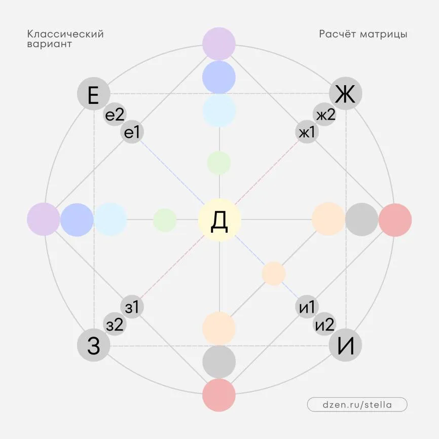 Матрица состоит из Личностного квадрата – в него входят все энергии в цветных кружочках – это диагональный квадрат (повёрнутый); а также из Родового квадрата – в него входят все энергии в серых кружочках на диагональных линиях прямого квадрата.