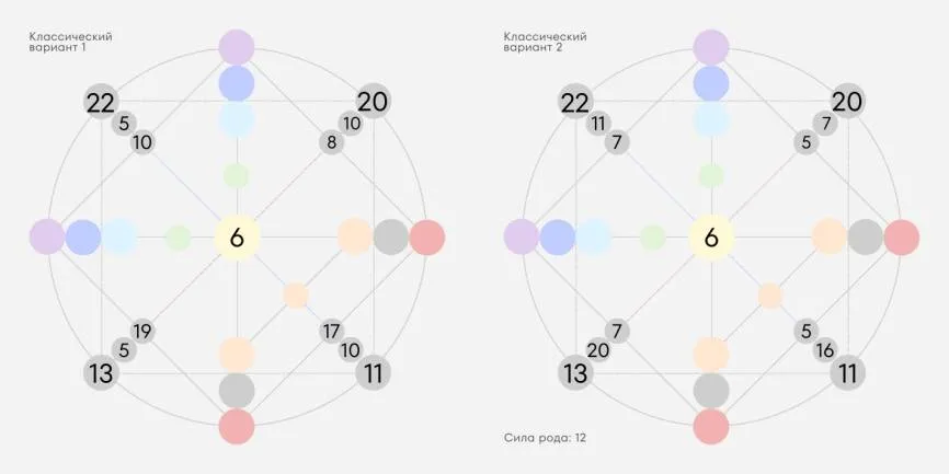 Во втором варианте дополнительные родовые энергии рассчитываются не с центральной энергией, а с «силой рода» – это сумма четырёх родовых энергий на крупных позициях.