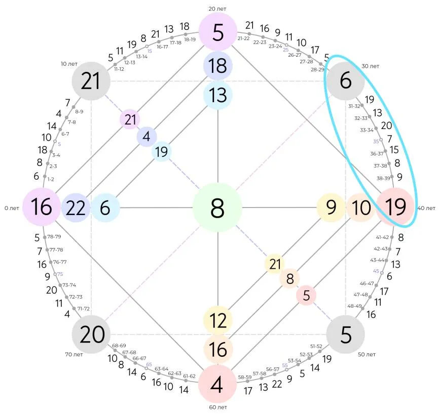 (4) Вычисляем 4 значение – период 31-32 года. Суммируем два ближайших числа – 6+13= 19. 19 энергия
