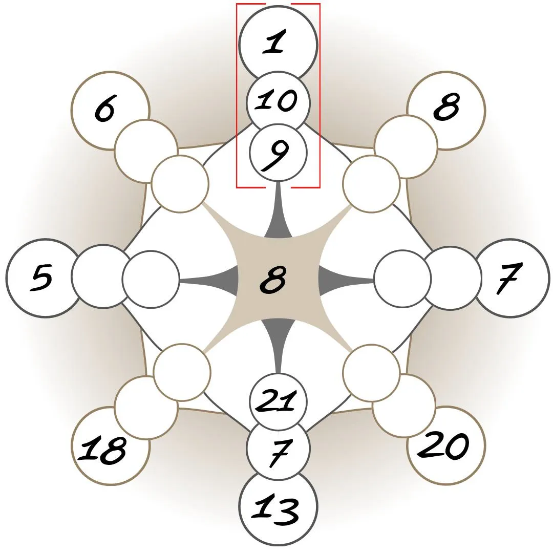 Для начала рассчитаем точку материальной кармы прошлого. Эта энергия стоит на стыке финансового канала прошлого и настоящего. Одна позиция нам уже известна – правый угол матрицы. Рассчитываем второе значение, путем сложения цифры центра и правой вершины матрицы: