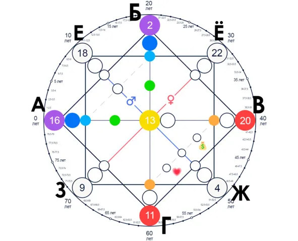 Возьмём, к примеру дату рождения 16.02.1973 и рассчитаем только 9 основных точек. (См. рис.)
