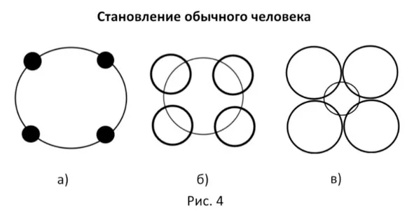 Это говорит нам о том, что все эти четыре малых круга структуры Нави получат своё максимальное расширение, которое только возможно для обычного человека. Далее они станут новым элементом внешнего существа нового вида, например для становления одухотворённого человека мира Верховного разума [5]. Тогда эта структура рисунка 2 получит новое внутреннее существо, внешнюю природу и внутреннюю природу уже из нового мира. Процесс её расширение будет тем же самым, что и рассмотренный нами ранее и показанный на рисунке 4.