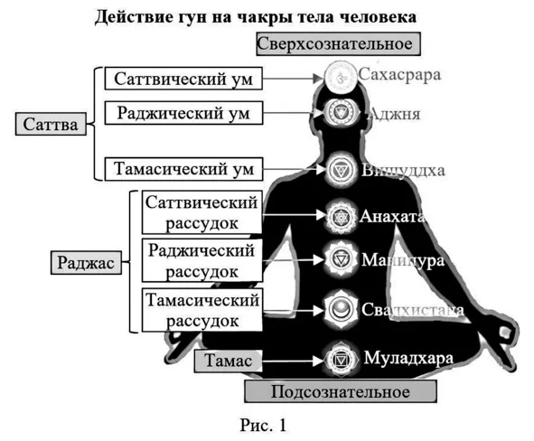 Чакры, через которые энергия гун поступает в наш разум, могут находиться в различных состояниях чистоты и прозрачности. Если чакра чиста, то вся светлая энергия этого качества гуны проходит через неё полностью и не искажается. Но наш обычный разум имеет правилом «заваливать» чакры «камнями», о которых мы говорили ранее [1]. Тогда энергия этого качества гуны, соответствующей чакре, сильно уменьшается и даже опрокидывается. Особенно это заметно в нашей старости. Вернее, она не уменьшается, а искажается, ведь «камни» отбрасывают тени. Тогда вместо светлой энергии гуны мы получаем её раздвоение на свет и тьму, что и приводит к негативным реакциям нашего разума, к разрушающему Тамасу, который и есть тень. Наша вялость и леность в жизни как раз соответствует уменьшению саттвической энергии Раджаса в сердечной чакре и даже к её закрытию. Это приведёт к увеличению тамасической энергии в другой чакре. Такое действие может происходить в любой чакре.
