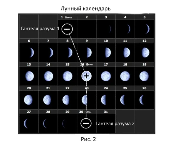 На рисунке 24 [1] показана «гантеля» состояний разума человека, которая позволяет нам изучать их. На Лунном календаре рисунка 2 мы показали две подобные «гантели» разума, которые соединили между собой два крайних состояния фаз Луны – «день» и «ночь». Естественно, между ними возникает множество промежуточных фазовых состояний. Это показывает нам, что, в зависимости от фазы Луны, мы можем обладать определённым состоянием разума и пока влиять на него никак не можем.