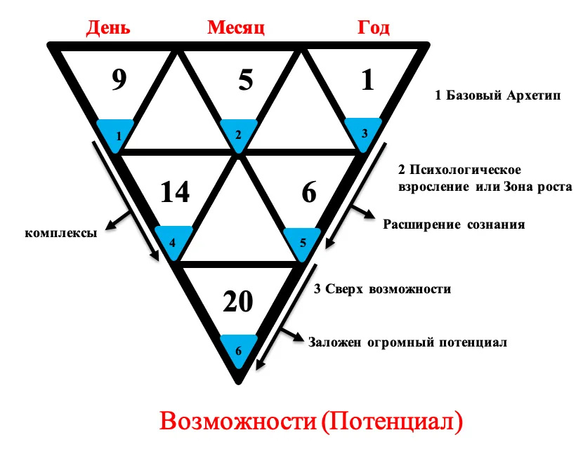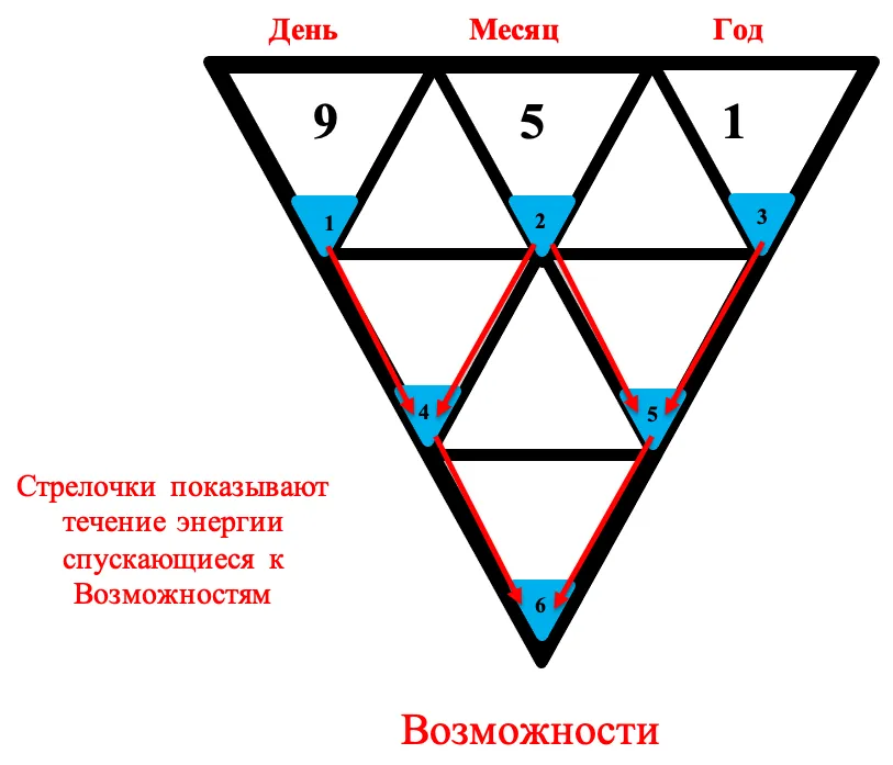 Затем рассчитываем месяц + год: 5+1=6, записали в 5-й треугольник цифру 6.