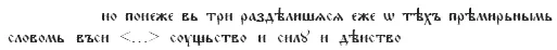 )15 Внутри себя умопостигаемая, абсолютная сфера разделяется по своему смыслу на три составляющих: сущность, силу (возможность) и действие. «По своему сверхмирному смыслу разделяется на три: сущность, силу и действие»16 (