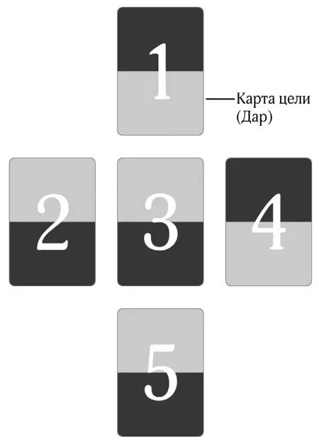 Карта 1. Выбери в колоде карту, которая будет символизировать твою цель (гармония, благополучие, инициативность и пр.), и выложи ее перед собой Даром вверх, как вершину креста для расклада.